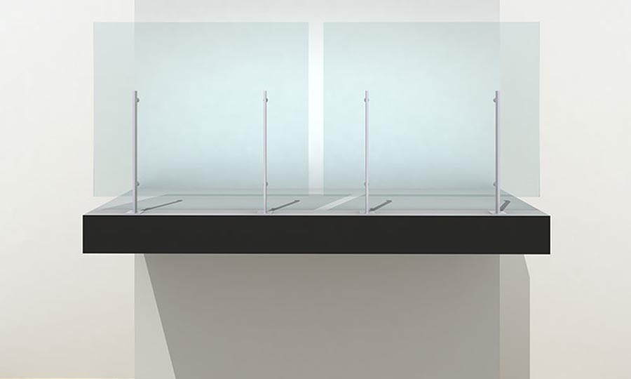 Supports: 2 No minimum stainless steel flat supports sized by manufacturers engineer to each glass panel and core drilled to concrete slabs and/or ramps.