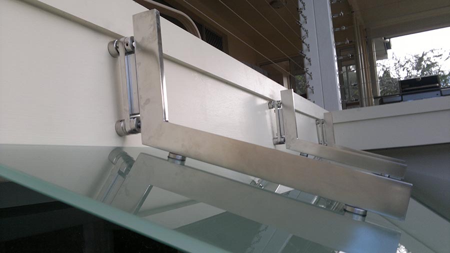 Supports: 2 No minimum stainless steel flat supports sized by manufacturers engineer to each glass panel and fascia fixed to substructure.