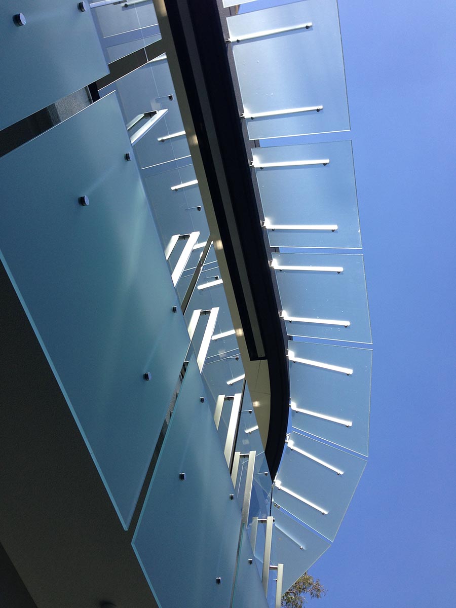 The X1-Series Sunshade Balustrade with Flatbar Rail is an extension of the Fascia Fix Balustrade. It incorporates stanchions which extend, vertically, below the floor level to support the sunshade panel. This panel with translucent or tinted glass can be used to reduce the amount of direct light and heat entering the lower level.