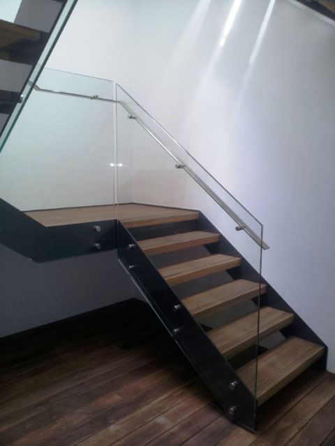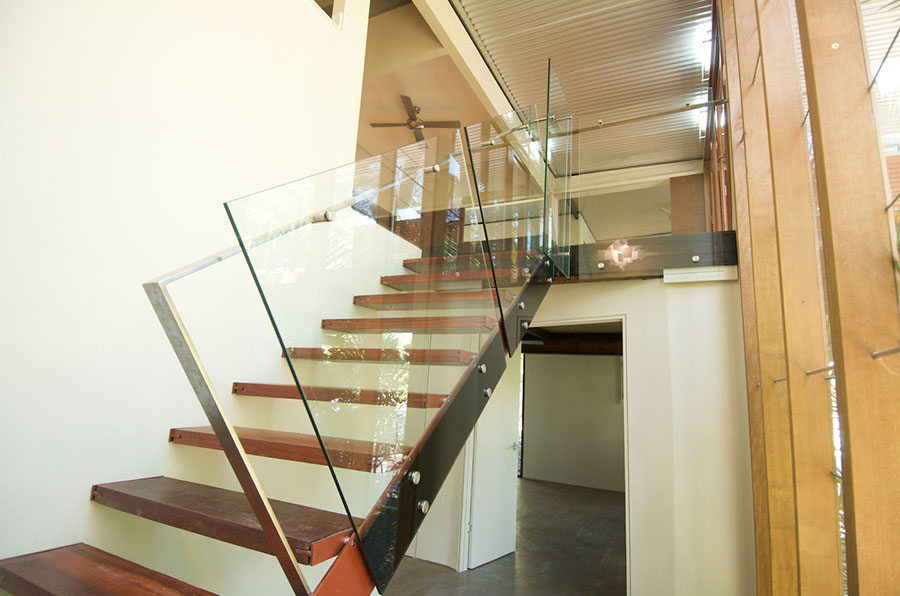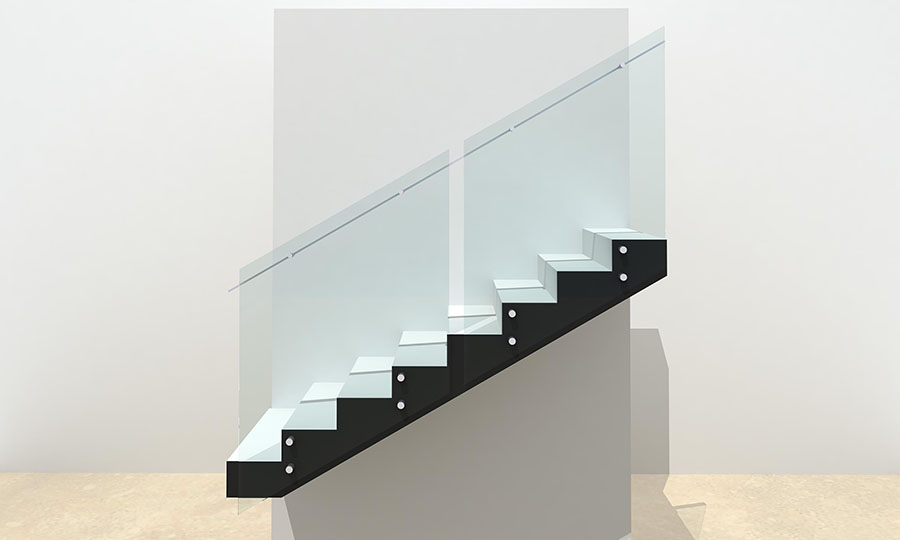 The X1 Series point fixed frameless glass balustrade with flatbar handrail system is designed to fix to the face of the landing or stair stringer structure, with stainless steel point fix standoffs, without the use of any stanchions.