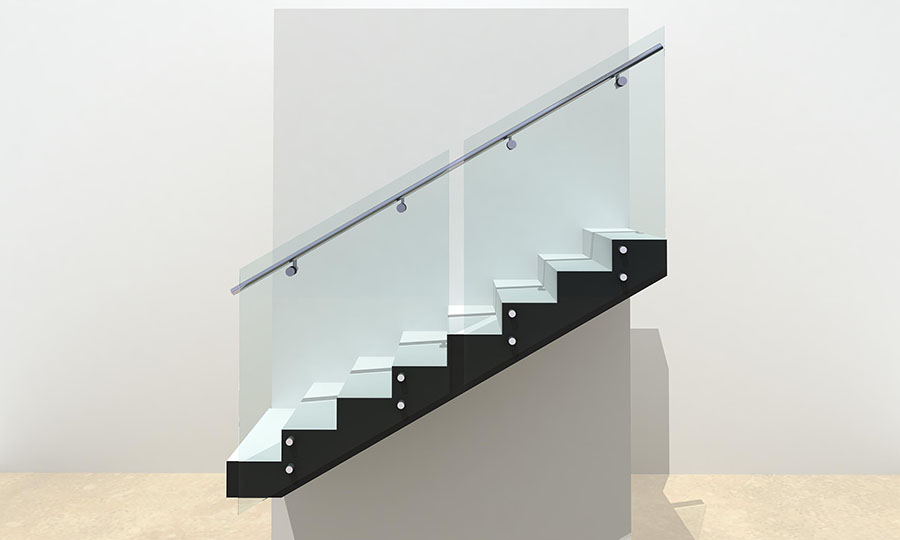 The X1 Series point fixed frameless glass balustrade with round handrail system is designed to fix to the face of the landing or stair stringer structure, with stainless steel point fix standoffs, without the use of any stanchions.