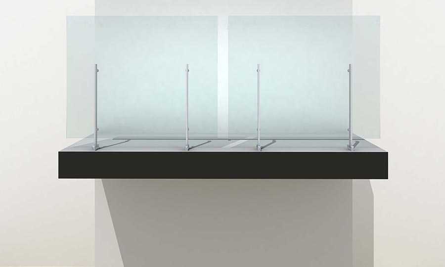 Supports: 2 No minimum stainless steel flat supports sized by manufacturers engineer to each glass panel and top mounted to substructure.